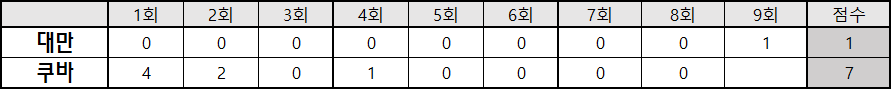 | 2023 WBC 1라운드 B조 체코 [3] : [7] 대한민국 기록 (1) | 2023.03.12 |
