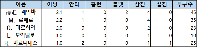 | (승)E. 레이바 | 2.1 | 1 | 0 | 2 | 4 | 0 | 45 |