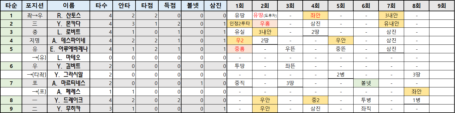 | 타순 | 포지션 | 이름 | 타수 | 안타 | 타점 | 득점 | 볼넷 | 삼진 |