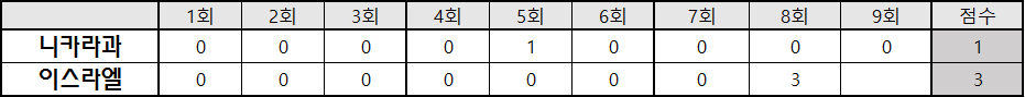 | 타순 | 포지션 | 이름 | 타수 | 안타 | 타점 | 득점 | 볼넷 | 삼진 |