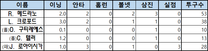 | 1 | 중 | J. 몬테스 | 4 | 1 | 0 | 0 | 0 | 2 |