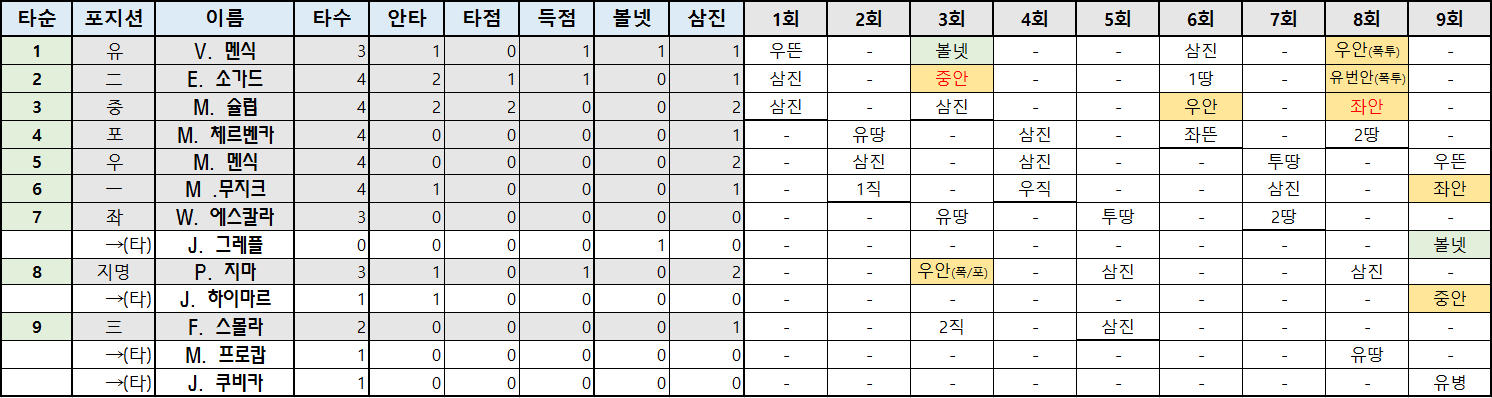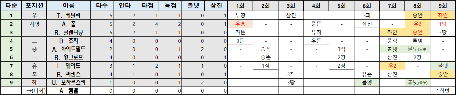 | 타순 | 포지션 | 이름 | 타수 | 안타 | 타점 | 득점 | 볼넷 | 삼진 |