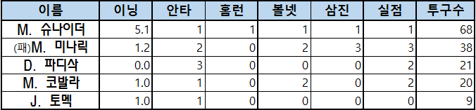 | 이름 | 이닝 | 안타 | 홈런 | 볼넷 | 삼진 | 실점 | 투구수 |