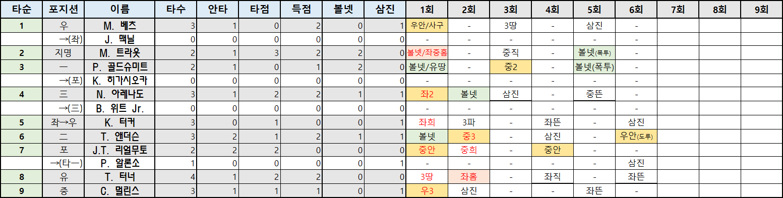 | 타순 | 포지션 | 이름 | 타수 | 안타 | 타점 | 득점 | 볼넷 | 삼진 |