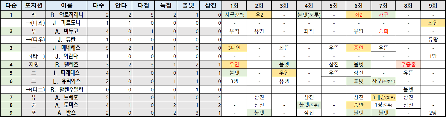 | 타순 | 포지션 | 이름 | 타수 | 안타 | 타점 | 득점 | 볼넷 | 삼진 |