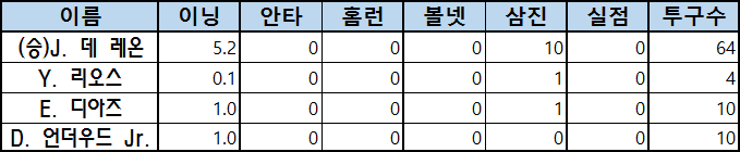 | (승)J. 데 레온 | 5.2 | 0 | 0 | 0 | 10 | 0 | 64 |