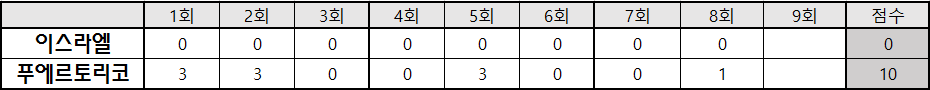 | 2023 WBC 1라운드 D조 이스라엘 [0] : [10] 도미니카 기록 (콜드게임) (0) | 2023.03.19 |