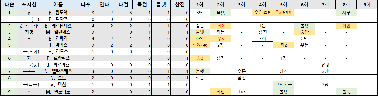 | 타순 | 포지션 | 이름 | 타수 | 안타 | 타점 | 득점 | 볼넷 | 삼진 |