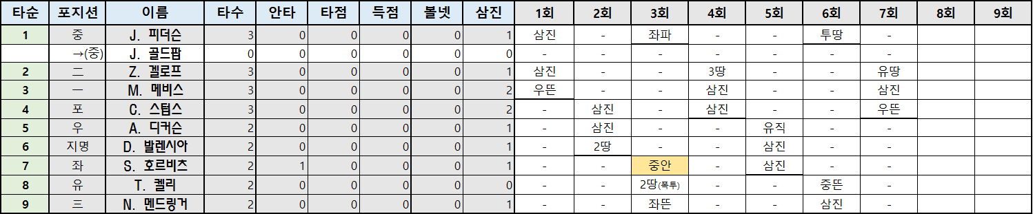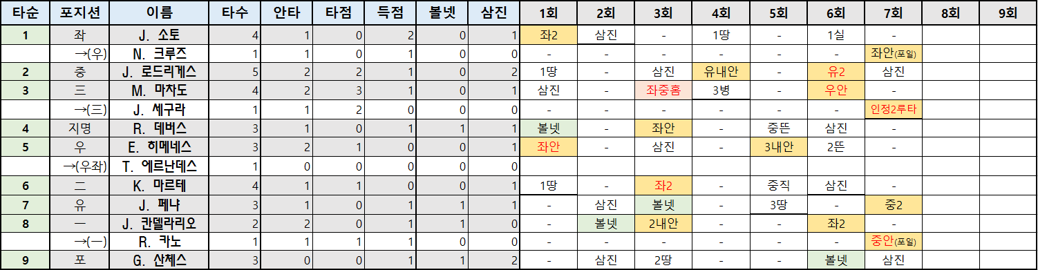 | 타순 | 포지션 | 이름 | 타수 | 안타 | 타점 | 득점 | 볼넷 | 삼진 |