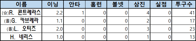 | (승)R. 콘트레라스 | 2.2 | 1 | 0 | 0 | 4 | 0 | 41 |