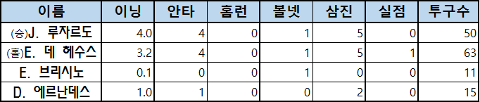 | (승)J. 루자르도 | 4.0 | 4 | 0 | 1 | 5 | 0 | 50 |