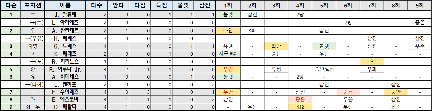 | 타순 | 포지션 | 이름 | 타수 | 안타 | 타점 | 득점 | 볼넷 | 삼진 |