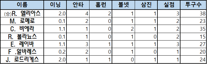 | 이름 | 이닝 | 안타 | 홈런 | 볼넷 | 삼진 | 실점 | 투구수 |