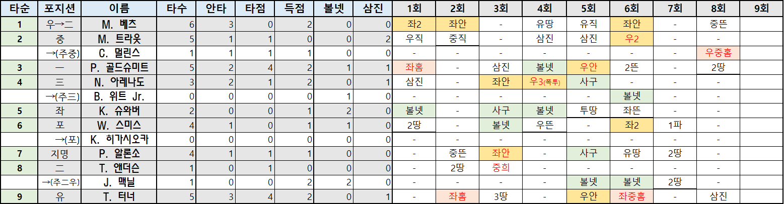 | 타순 | 포지션 | 이름 | 타수 | 안타 | 타점 | 득점 | 볼넷 | 삼진 |