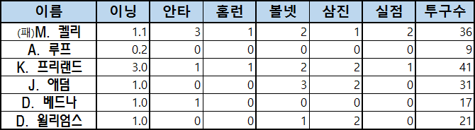 (패)M. 켈리 | 1.1 | 3 | 1 | 2 | 1 | 2 | 36 |