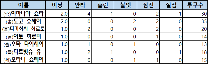 (승)이마나가 쇼타 | 2.0 | 4 | 1 | 0 | 2 | 1 | 30 |