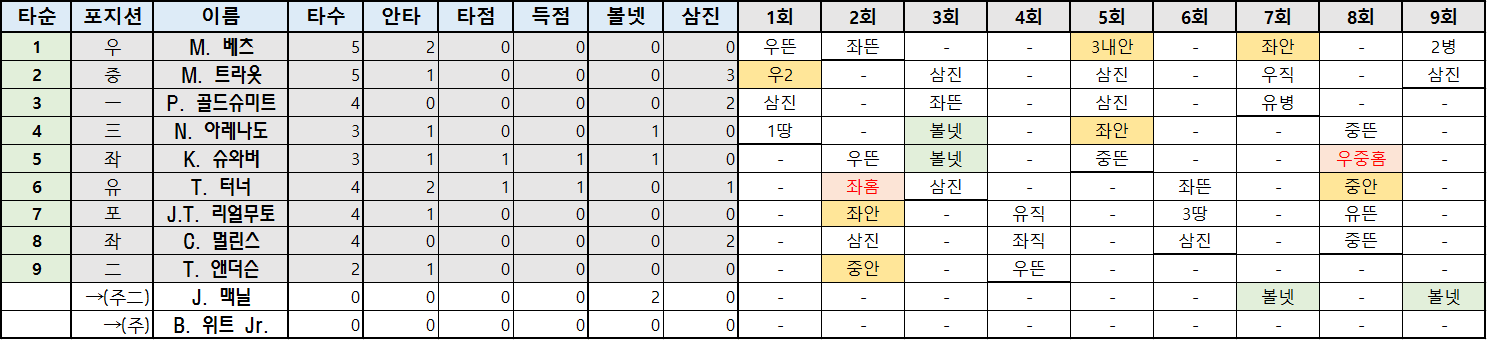 3 | 一 | P. 골드슈미트 | 4 | 0 | 0 | 0 | 0 | 2 |