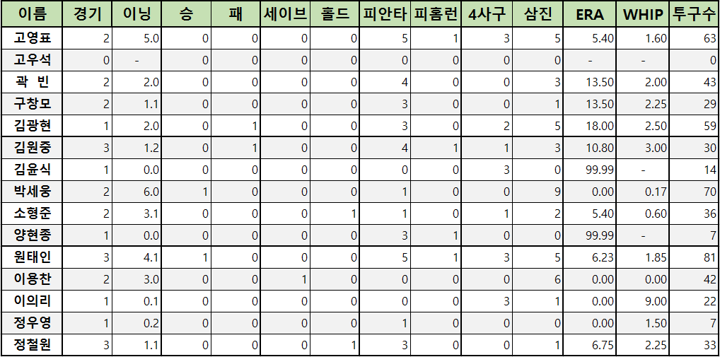 | 이름 | 경기 | 이닝 | 승 | 패 | 세이브 | 홀드 | 피안타 | 피홈런 | 4사구 | 삼진 | ERA | WHIP | 투구수 |