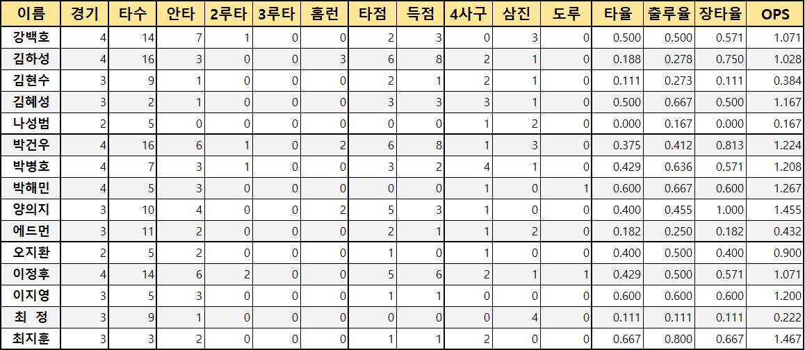 | 김현수 | 3 | 9 | 1 | 0 | 0 | 0 | 2 | 1 | 2 | 1 | 0 | 0.111 | 0.273 | 0.111 | 0.384 |