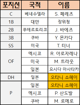 대회 MVP : 오타니 쇼헤이 (투수 - 2승0패1세이브 ERA1.86 11K / 타자 - 23타수 10안타 (0.435) 1홈런)