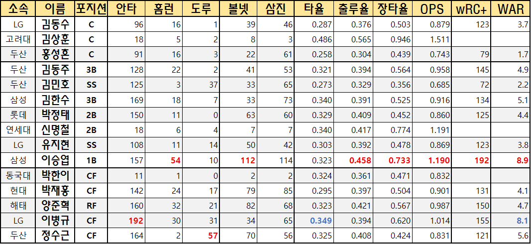 | 소속 | 이름 | 포지션 | 안타 | 홈런 | 도루 | 볼넷 | 삼진 | 타율 | 출루율 | 장타율 | OPS | wRC+ | WAR |