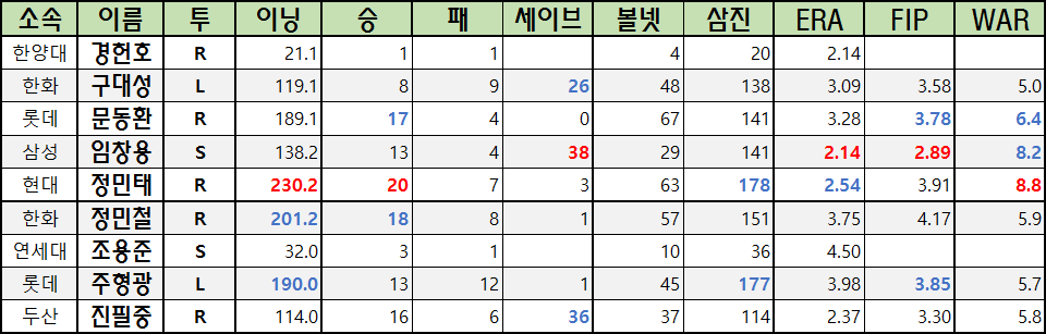 | 소속 | 이름 | 투 | 이닝 | 승 | 패 | 세이브 | 볼넷 | 삼진 | ERA | FIP | WAR |