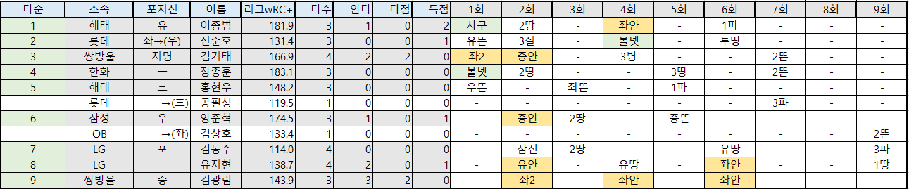 | 타순 | 소속 | 포지션 | 이름 | 리그wRC+ | 타수 | 안타 | 타점 | 득점 |