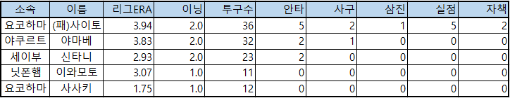 | 요코하마 | (패)사이토 | 3.94 | 2.0 | 36 | 5 | 2 | 1 | 5 | 2 |