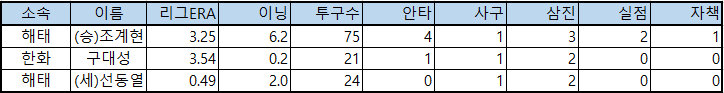| 5 | 해태 | 三 | 홍현우 | 148.2 | 3 | 0 | 0 | 0 |