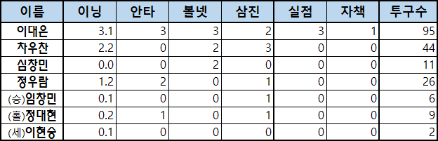 | 이름 | 이닝 | 안타 | 볼넷 | 삼진 | 실점 | 자책 | 투구수 |
