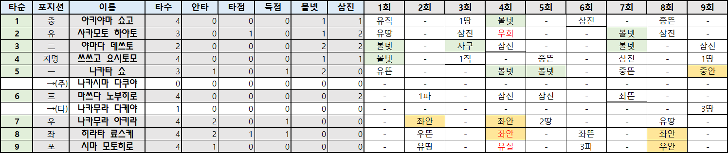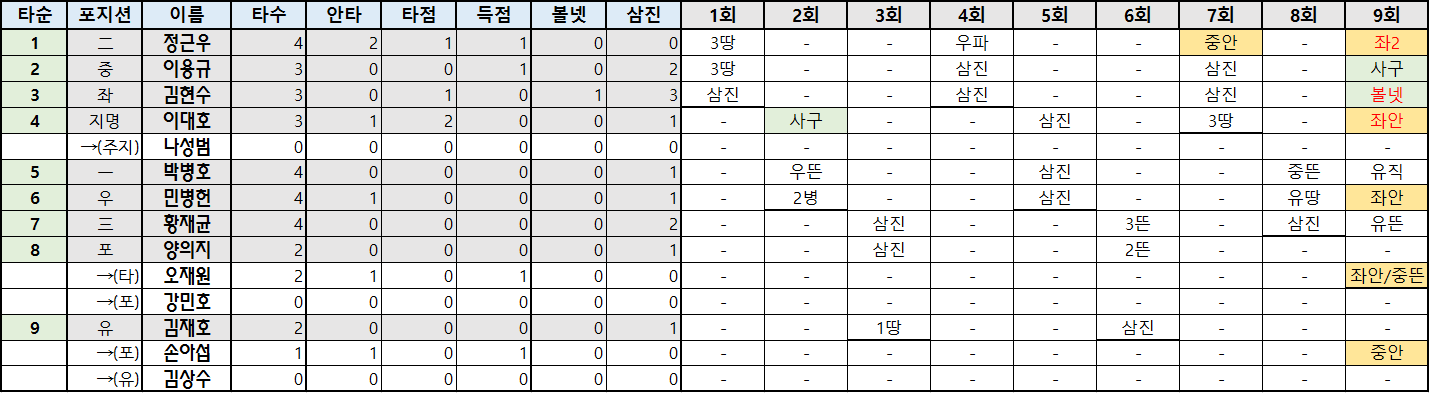 | 타순 | 포지션 | 이름 | 타수 | 안타 | 타점 | 득점 | 볼넷 | 삼진 |