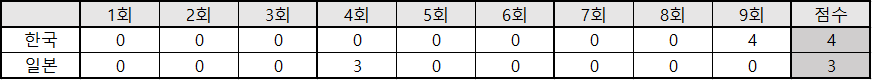 | 2 | 유 | 사카모토 하야토 | 3 | 0 | 1 | 0 | 1 | 2 |