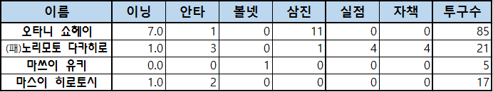 | 오타니 쇼헤이 | 7.0 | 1 | 0 | 11 | 0 | 0 | 85 |