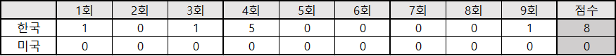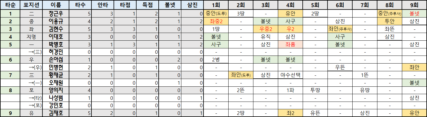 | 타순 | 포지션 | 이름 | 타수 | 안타 | 타점 | 득점 | 볼넷 | 삼진 |