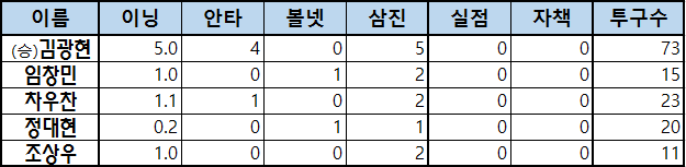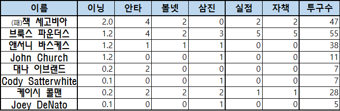 | 이름 | 이닝 | 안타 | 볼넷 | 삼진 | 실점 | 자책 | 투구수 |