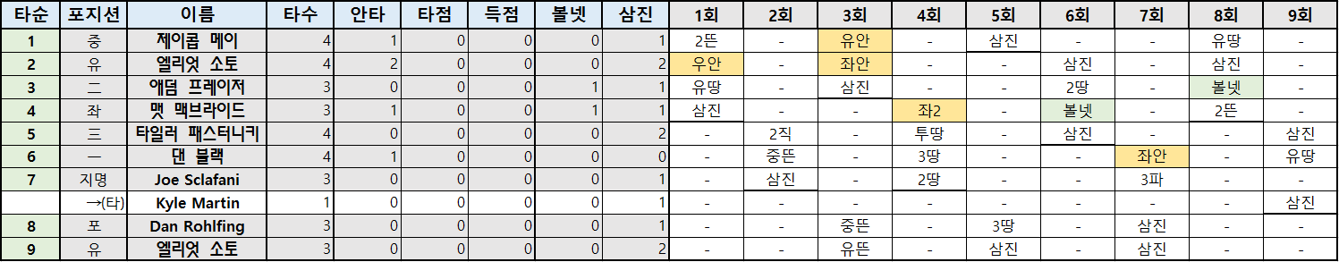 | 타순 | 포지션 | 이름 | 타수 | 안타 | 타점 | 득점 | 볼넷 | 삼진 |