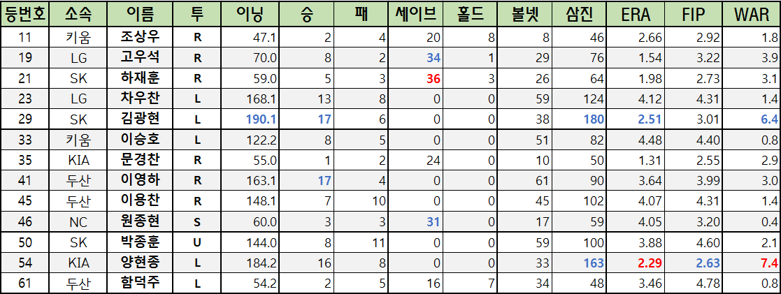 | 50 | SK | 박종훈 | U | 144.0 | 8 | 11 | 0 | 0 | 59 | 100 | 3.88 | 4.60 | 2.1 |
