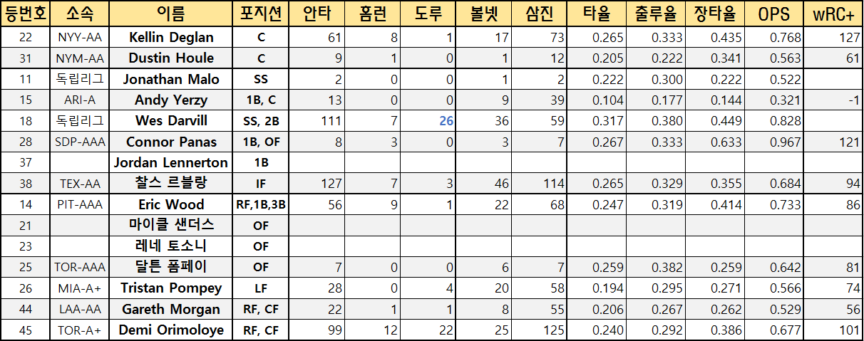 | 18 | 독립리그 | Wes Darvill | SS, 2B | 111 | 7 | 26 | 36 | 59 | 0.317 | 0.380 | 0.449 | 0.828 | |
