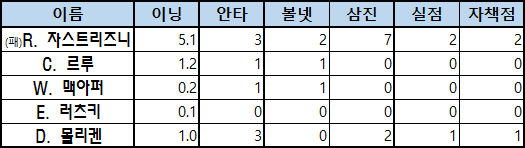 | 이름 | 이닝 | 안타 | 볼넷 | 삼진 | 실점 | 자책점 |