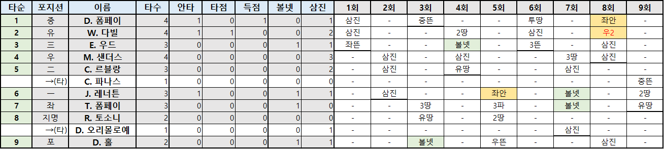 | 9 | 포 | D. 홀 | 2 | 0 | 0 | 0 | 1 | 1 |