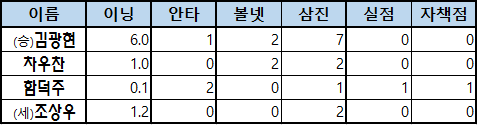 | 이름 | 이닝 | 안타 | 볼넷 | 삼진 | 실점 | 자책점 |