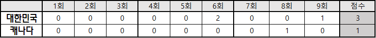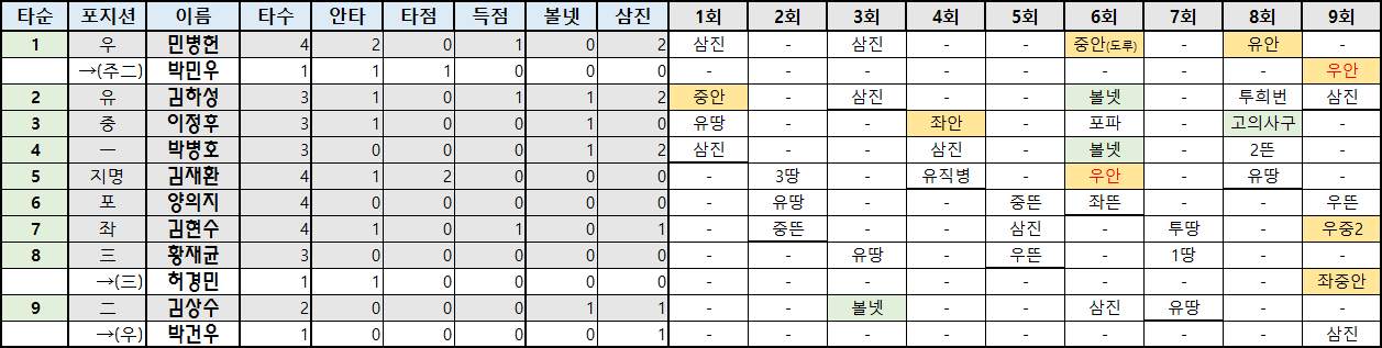 | 타순 | 포지션 | 이름 | 타수 | 안타 | 타점 | 득점 | 볼넷 | 삼진 |