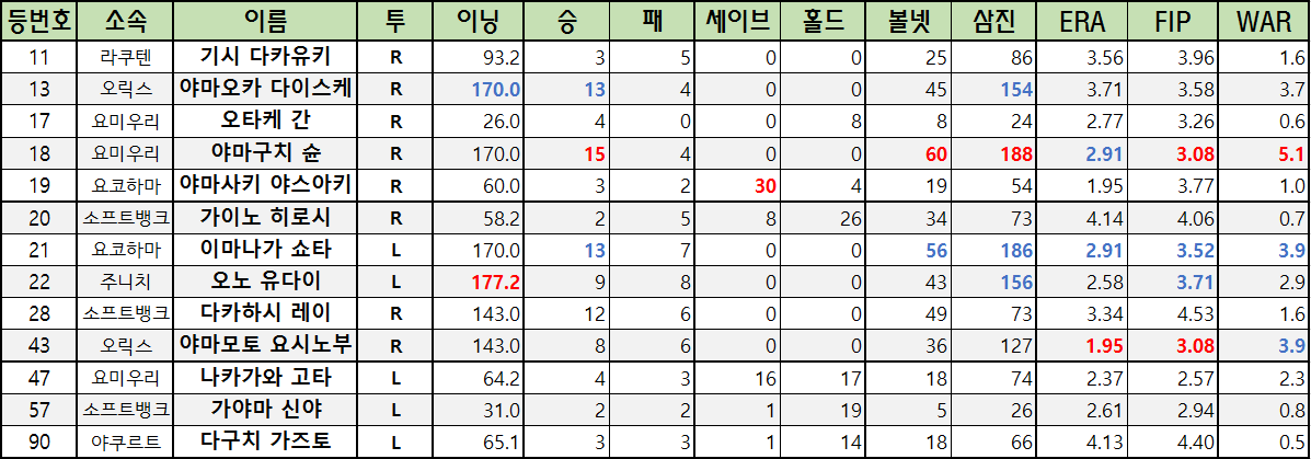 | 22 | 주니치 | 오노 유다이 | L | 177.2 | 9 | 8 | 0 | 0 | 43 | 156 | 2.58 | 3.71 | 2.9 |