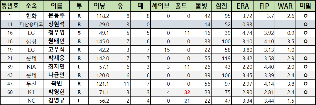 | 등번호 | 소속 | 이름 | 투 | 이닝 | 승 | 패 | 세이브 | 홀드 | 볼넷 | 삼진 | ERA | FIP | WAR | 미필 |