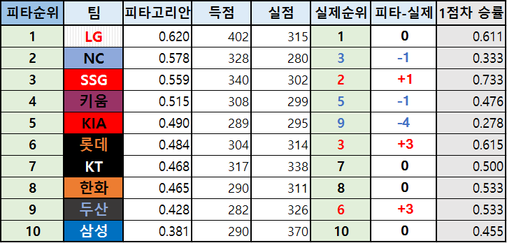 | 피타순위 | 팀 | 피타고리안 | 득점 | 실점 | 실제순위 | 피타-실제 | 1점차 승률 |