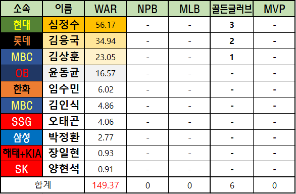 메이저리그 WAR은 bWAR와 fWAR의 평균값으로 표기했습니다.
