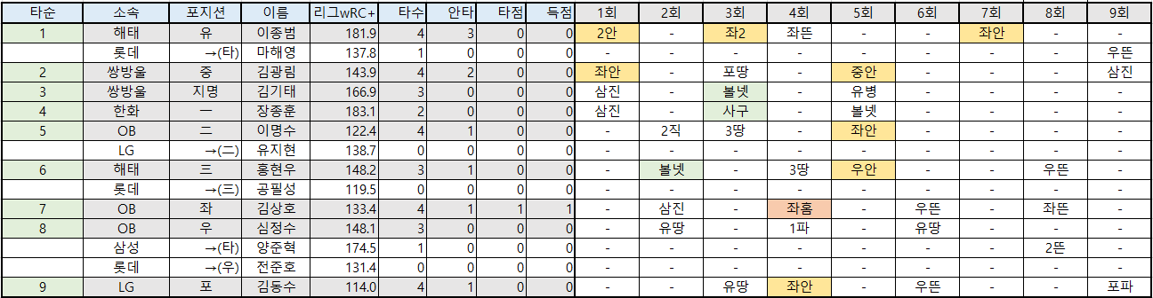 | 타순 | 소속 | 포지션 | 이름 | 리그wRC+ | 타수 | 안타 | 타점 | 득점 |