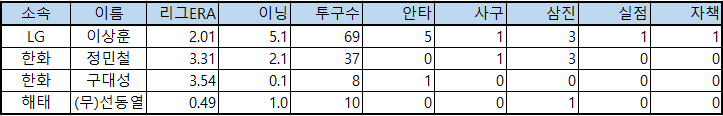 | LG | 이상훈 | 2.01 | 5.1 | 69 | 5 | 1 | 3 | 1 | 1 |