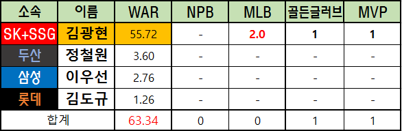 | SK+SSG | 김광현 | 55.72 | - | 2.0 | 1 | 1 |