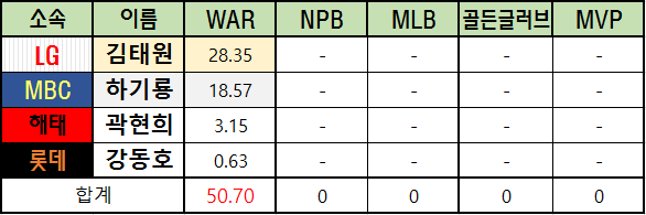 메이저리그 WAR은 bWAR와 fWAR의 평균값으로 표기했습니다.